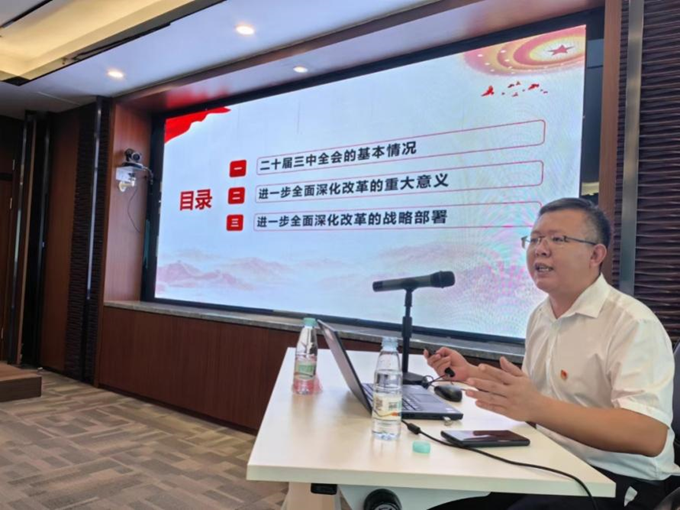 为进一步深入学习贯彻党的二十届三中全会精神,9月23日下午,pt真人电子·[中国区]有限公司 在公司会议室举办学习贯彻党的二十届三中全会精神专题讲座,特邀中共海南省委党校讲师、海南省监察委首届特约监察员王伟老师作专题授课。pt真人电子·[中国区]有限公司 党委书记廖宪主持。
